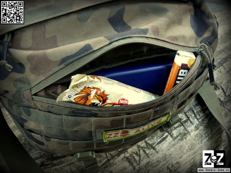 Główna komora jest dość pojemna. W chwili robienia zdjęć znajdują się w niej: bluza Helikon Australian, ponczo Helikon Camogrom i kilka mniejszych przedmiotów. W głównej komorze, po bokach znajdują się dwie przegródki służące do przechowywania butelek typu Nalgene, manierek lub termosów. Duża siatkowa kieszeń zamykana na zamek błyskawiczny to doskonały schowek na drobne przedmioty. Ostatnia kieszeń, umieszczona z tyłu została wyłożona pianką i mieści książkę, lub tablet. Naszyto na nią elastyczne taśmy w systemie MOLLE, które według mnie słabo się sprawdzają jako organizer, dlatego że cała kieszeń zaczyna bezwładnie zwisać. Po dłuższym użytkowaniu, nici z taśm zaczęły się odpruwać.